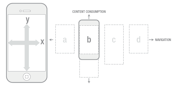 而y轴上的操作则通常用于内容浏览。目前来看,iOS对于界面的纵向长度是没有限制的。也就是说,所有y轴上的交互行为都是发生在同一个界面空间中的;这与x轴上的行为方式形成了鲜明的对比。正像前面提到的,x轴上的交互行为能够让我们对一组各自独立的界面空间产生感知;在这些空间中,我们必须逐一前进或后退。而y轴上的交互体验则要流畅的多。