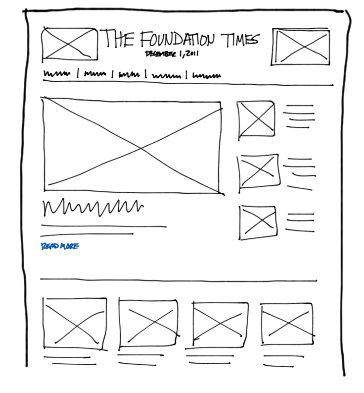 最好拿起纸和笔,在创建原型之前将构思勾画出来。下面是我们为基础版本的首页(桌面显示器版本)画的草图: