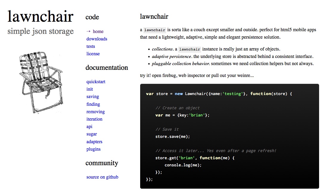 Lawnchair也是一款轻量级JS库,它最大的特色是,可以将客户端抽象为持久化的“无SQL”风格的数据存储空间。它采用适配器模式,支持多重回调机制。语法风格非常简单直白,支持简单的query查询。