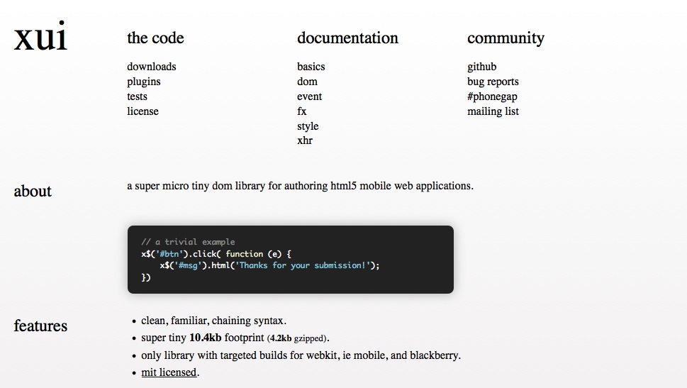 作为一款轻量级JavaScript框架,XUI是特别为移动版本的浏览器打造的。XUI的侧重点是移动浏览器中最常见的功能需求,以最少的代码量实现最基本的功能。语法方面也很简单,不过与jQuery的风格有所区别,需要加以习惯。